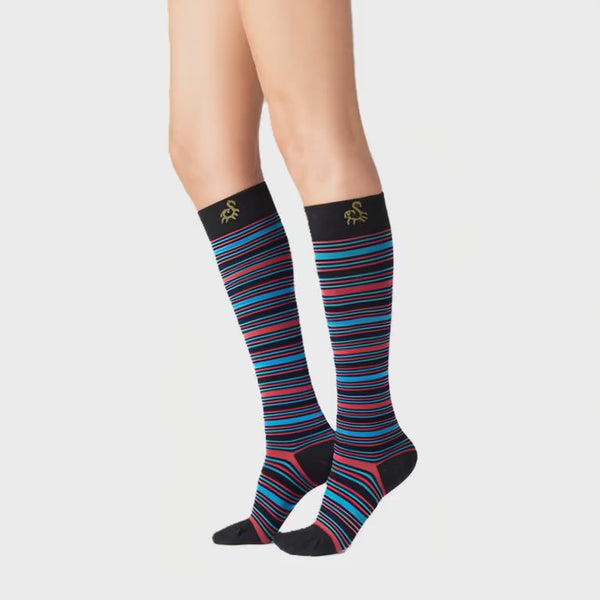 Solidea’s Stripe Game Altair are unisex, striped knee-high compression socks delivering 15–21 mmHg graduated compression in a soft bamboo-viscose knit. They pair everyday, stylish stripes with true graduated support—firmer at the ankle, gentler up the calf—so legs feel lighter through long sitting, standing, or travel.