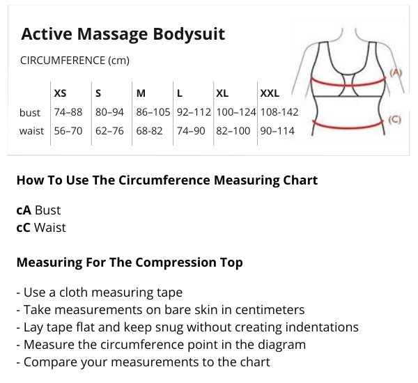 Active Massage compression bodysuit provides high compression results with lower compression comfort. This innovative fabric makes the garment easier to put on and more comfortable to wear all day.